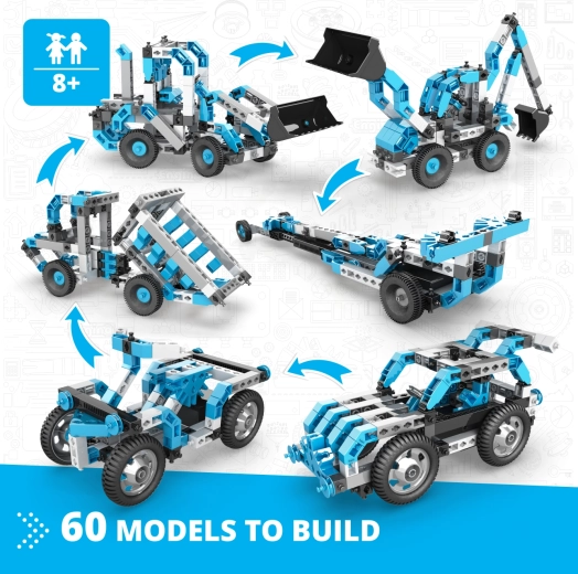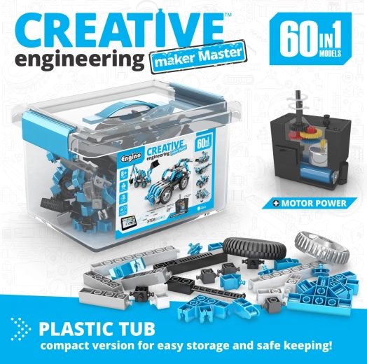 Az ENGINO Motorized Maker 60 az 1-ben építőkészlet ideális választás 8 éves kortól azoknak a gyerekeknek, akik szeretik a technikát és az alkotást. A színes útmutatók (részben nyomtatott, részben online vagy az ingyenes 3D alkalmazásban) végigvezetnek több tucat modell megépítésén. Az elemek könnyen összepattinthatók, a teljes készlet pedig egy praktikus műanyag kofferben kapott helyet az egyszerű szállításhoz és tároláshoz.