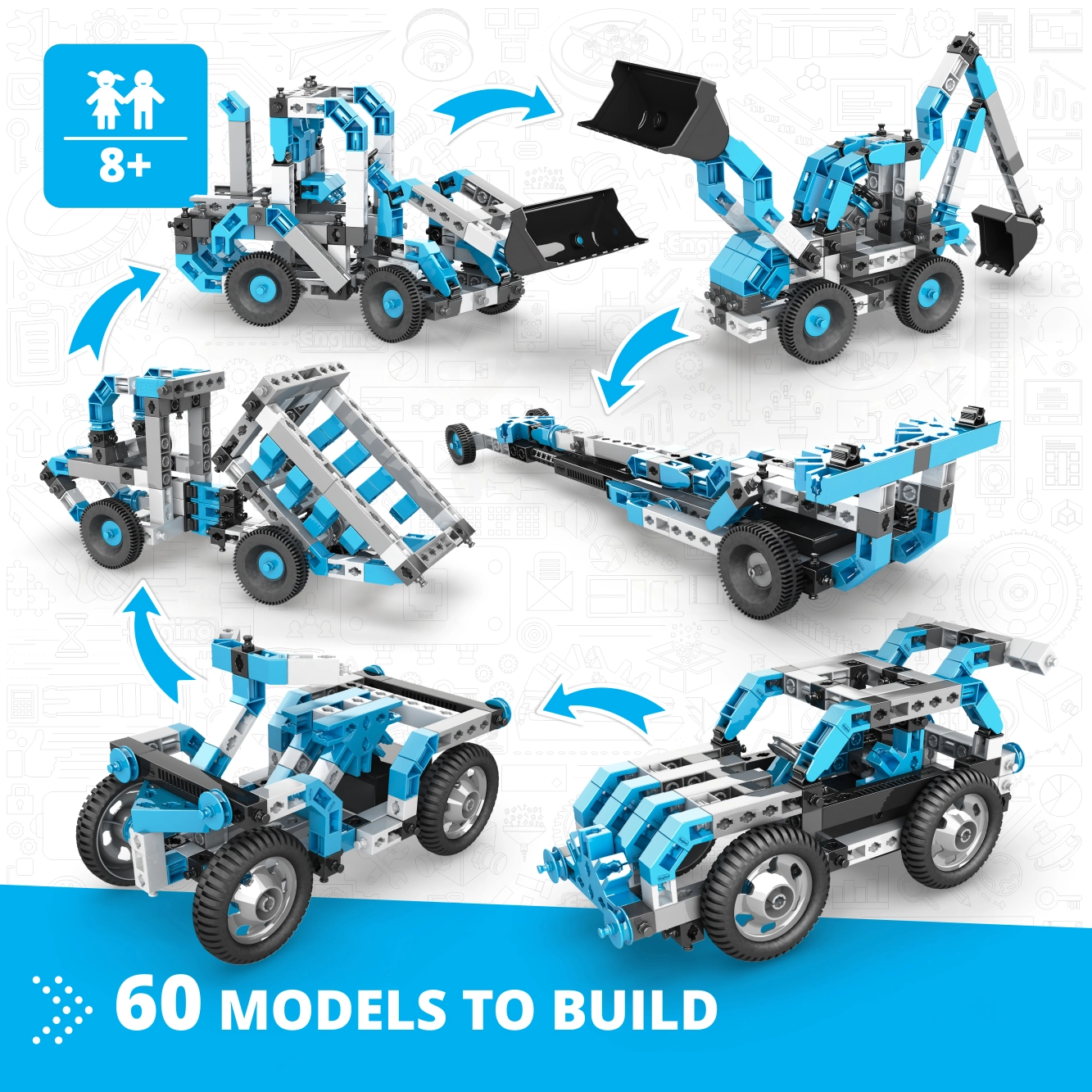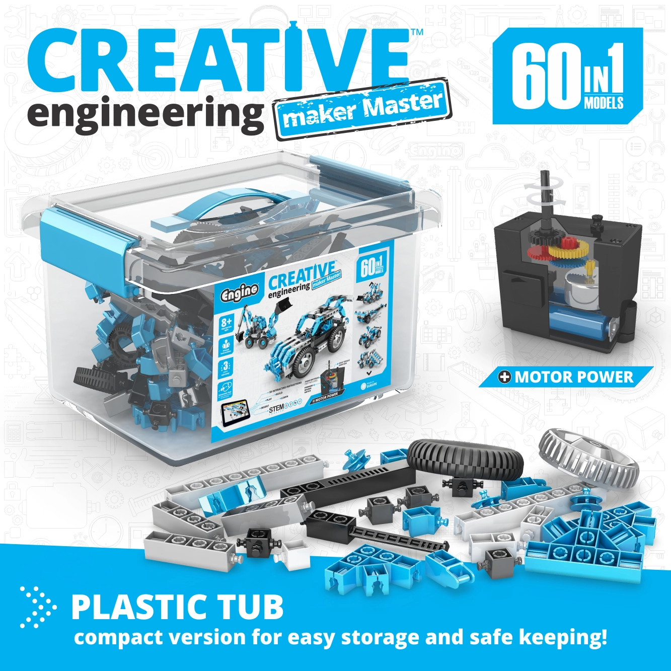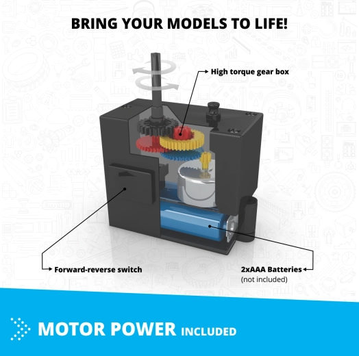 A nagy teljesítményű, fogaskerék-áttételes, nagy nyomatékú motor életre kelti a modelleket. A készlet támogatja a STEM (tudomány, technológia, mérnöki tudomány, matematika) elveit, és motiválja a gyerekeket a kísérletezésre, illetve saját konstrukciók megalkotására.