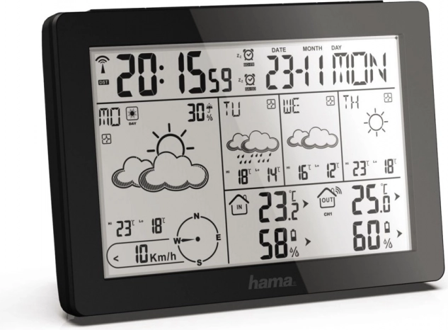 - Digitális kijelzés: hőmérséklet, idő, professzionális időjárás-előrejelzés, páratartalom és csapadékvalószínűség, szélsebesség és -irány