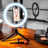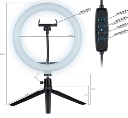 A vezérlés gyors és intuitív a USB-kábelre integrált, háttérvilágításos kezelővel, amellyel be- és kikapcsolhatod a fényt, valamint állíthatod a fényerőt és a színt. A telefontartót közvetlenül a gyűrű közepére helyezheted az arc egyenletes megvilágításához. A mini asztali állvány forgatható és állítható fejjel pontos szögbeállítást tesz lehetővé.