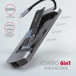 AXAGON HMC-6M2 COMBO 6 az 1-ben egyszerű és kompakt dokkolóállomást biztosít notebookok számára, mint például a MacBook Pro. Gyorsan csatlakoztasson két USB eszközt, Ethernet hálózatot, HDMI kijelzőt és M.2 SSD lemezt. A Power Delivery technológiának köszönhetően akár 100W-tal is töltheti laptopját. A HDMI kimenet akár 4K/30Hz Ultra HD felbontást támogat.