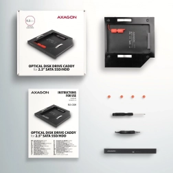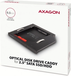 Az AXAGON RSS-CD09 keret a 9,5 mm magas CD/DVD-meghajtó helyére történő telepítésre szolgál, és támogatja a SATA 2,5" SSD/HDD lemezeket. Az SATA 6G kompatibilitásának köszönhetően akár 6 Gb/s modern sebességet kínál anélkül, hogy a funkcionalitás, például a TRIM elveszne. A keret kettős kapcsolóval van felszerelve, amely biztosítja a széleskörű kompatibilitást olyan notebookokkal, mint a LENOVO, HP, DELL és mások.