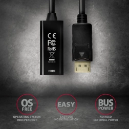 Axagon DisplayPort to HDMI Adapter lehetővé teszi, hogy könnyedén csatlakoztassunk TV-t, monitort vagy projektort DisplayPort kimenetű számítógéphez. Támogatja a felbontást akár 4K/30Hz-ig, és biztosítja a kiváló kép- és hangátvitelt.