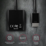 Az adapter közvetlenül a HDMI-ről kap tápot, így nincs szükség külső tápellátásra. A hardveres konverziónak köszönhetően illesztőprogramok nélkül működik bármely operációs rendszerben, és támogatja a tükrözést és a kiterjesztett asztalt is. A kompakt méretek és a kb. 17 cm-es fix kábel ideális útitárssá és irodai kiegészítővé teszik.