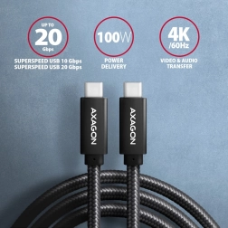 Prémium AXAGON USB‑C ↔ USB‑C kábel adatátvitelhez és töltéshez, amely akár 20 Gb/s sebességet, Power Delivery 100 W / 5 A támogatást, 4K@60 Hz videót és megbízhatóságot kínál az alumínium csatlakozóknak, a nylonfonatú köpenynek, a TPE burkolatnak és az integrált E‑Marker chipnek köszönhetően.