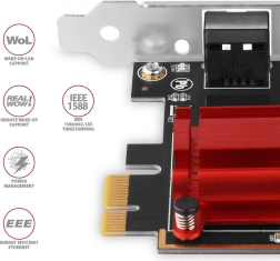 Az AXAGON PCEE‑G25 extragyors 2.5GBase‑T kapcsolatot ad a PC‑hez szabványos RJ‑45 csatlakozón keresztül. A IEEE 802.3bz szabványnak köszönhetően akár 2,5 Gb/s sebesség is elérhető a szokványos Cat 5e / Cat 6 kábeleken 100 m‑ig. Ideális otthoni és vállalati hálózatok frissítéséhez, további LAN port hozzáadásához vagy hibás integrált kártya kiváltásához.