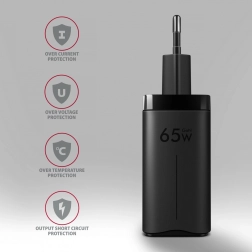 Az univerzális, összesen 65W teljesítményű töltő gyorsan tölti a telefonokat, táblagépeket és laptopokat. Két kétoldalas USB‑C és egy USB‑A port rugalmas töltési kombinációkat kínál intelligens teljesítményelosztással. A GaN chipkészletnek köszönhetően a töltőházzal jelentősen kisebb, könnyebb és hatékonyabb – ideális utazáshoz.