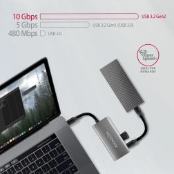 Bővítse a csatlakozást egyetlen mozdulattal. Ez a karcsú hub két USB-A és két USB-C porttal minden kimeneten biztosítja a 10 Gb/s teljes sebességet a USB 3.2 Gen 2 interfésznek köszönhetően. Ideális külső SSD-khez, NVMe M.2 házakhoz, pendrive-okhoz és egyéb perifériákhoz, miközben okostelefonok és táblagépek töltését is kezeli akár 3 A-ig.