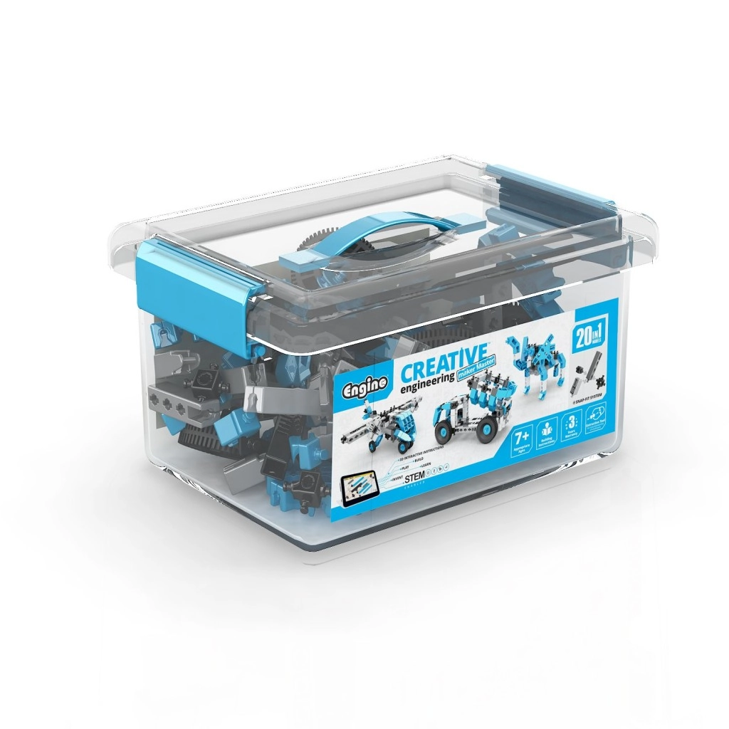 Fedezze fel a sokoldalú ENGINO építőkészletet akár 20 modellel egyben egy praktikus dobozban. A 7 éves kortól ajánlott szett támogatja a kreativitást, a STEM tanulást és a finommotorikát. A kék, fehér, fekete és szürke színű elemek könnyen összeilleszthetők és újraépíthetők. A csomag része az interaktív kidCAD alkalmazás, amellyel 3D-ben megjelenítheti, forgathatja és szerkesztheti a modelleket. Mindehhez átlátszó fedeles, fogantyús doboz jár a könnyű szállításhoz és rendszerezéshez.