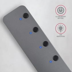 Minden USB-port külön gombbal ki- vagy bekapcsolható. Így a felesleges eszközök könnyen leválaszthatók anélkül, hogy fizikailag kihúzná őket a hubból. Minden USB-A portnál kék LED jelzi az állapotot: világít = port bekapcsolva, nem világít = port kikapcsolva.