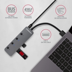 Az AXAGON HUE-MSA USB 3.2 Gen 1 (USB 3.0) fém USB-elosztó akár négy USB-eszköz csatlakoztatását is lehetővé teszi laptophoz vagy számítógéphez. USB-portok egyenkénti kikapcsolását és töltőhub funkciót is kínál.
