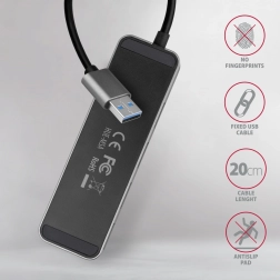 A hub alumíniumból készült fémháza kiváló mechanikai védelmet nyújt gyakori hordozás mellett. A finom textúrájú, elegáns felület ellenáll az ujjlenyomatoknak. A gumitalpak megakadályozzák az asztalon való csúszkálást. A 20 cm hosszú, masszív USB-kábel ideális mobil eszközöket használók számára.