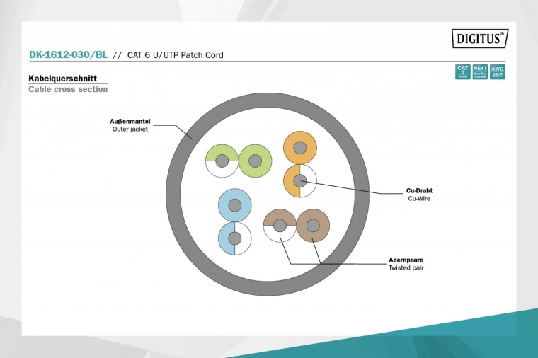 A DIGITUS 6. kategóriájú, E osztályú kábel az ISO/IEC 11801 és a DIN EN 50173 (CAT 6) szerint készül és tesztelt. Biztosítja, hogy a telepítés megfeleljen az ISO és EN csatorna-specifikációknak, és stabil, alacsony veszteségű adatátvitelt nyújt a hálózatban. A teljesítmény 250 MHz-ig igazolt, beleértve az olyan paramétereket, mint a NEXT áthallás.