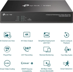 A VIGI NVR1004H-4P kompakt NVR 4 IP kamerához, amely ötvözi a magas képminőséget és az egyszerű üzembe helyezést. A 4K HDMI kimenetnek és az akár 16 MP dekódolásnak köszönhetően éles áttekintést kap több nézőpontból. A beépített PoE+ portok egyetlen kábellel látják el árammal és csatlakoztatják a kamerákat, felgyorsítva a telepítést és csökkentve a költségeket.