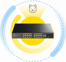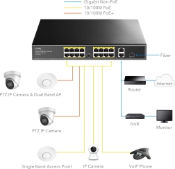 A 16 portos 10/100M PoE+ kapcsoló hálózati alkalmazások hatékony áramellátására és adatátvitelére lett tervezve. Beépített 2 db 10/100/1000M uplink porttal és egy kombinált SFP porttal rugalmasságot nyújt a hálózat bővítéséhez.
