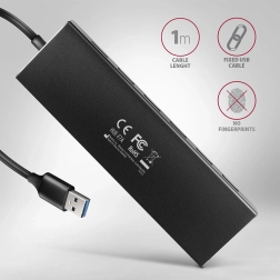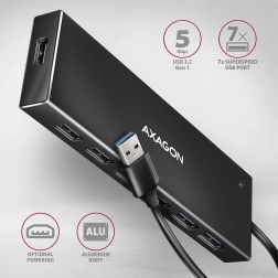 AXAGON HUE-F7A egy karcsú, alumíniumból készült hub, amely magas mechanikai ellenállást biztosít, és megakadályozza az ujjlenyomatok kialakulását. A hub egy különálló USB-A portot kínál az elülső részén, a nagyobb eszközök egyszerű csatlakoztatásához.