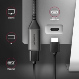 A védelem és tartósság biztosítva vannak a nikkelbevonatú fém végződések és aranyozott csatlakozók révén, míg a nejlon szövés hosszú élettartamot garantál. Egyirányú átalakítás USB-C-ről HDMI-re, amely DisplayPort Alternate Mode támogatást igényel a megfelelő működéshez. A jel átvitele külső tápellátás nélkül valósul meg. Élvezze a készülékek USB-C-n keresztüli csatlakoztatásának egyszerűségét és hatékonyságát.