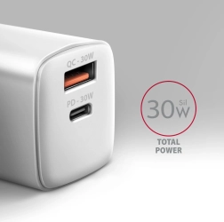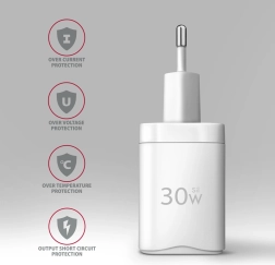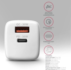 Gyors és univerzális töltő telefonokhoz, tabletekhez és kisebb laptopokhoz. A USB‑C PD 3.0 / QC 4+ és a USB‑A QC 3.0 kimenetek önálló töltésnél akár 30 W‑ot biztosítanak, két eszköz egyidejű töltésekor pedig intelligens teljesítménymegosztást. A PPS támogatás optimális feszültséget és áramot garantál a modern okostelefonokhoz.