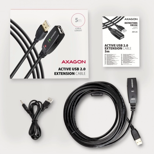 Az aktív AXAGON ADR-205 kábel egyszerű és megbízható USB kapcsolat meghosszabbítására lett tervezve. Az erősítőnek köszönhetően az eszközök nagyobb távolságra csatlakoztathatók, mint a hagyományos passzív kábelekkel. Magas sebességű kommunikációt és minimális interferenciát biztosít a kiváló minőségű kábel árnyékolásnak köszönhetően.