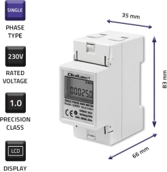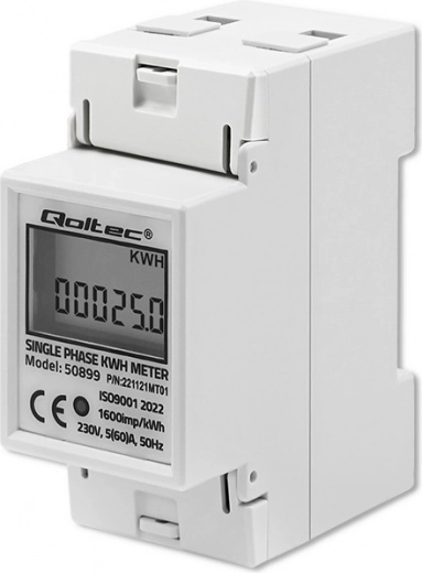 A Qoltec márkájú elektronikus energiamérő folyamatos megfigyelést biztosít az egyfázisú, váltakozó áramú 230V-os, 50Hz frekvenciájú készülékek áramfelvételéről. LED indikátorral rendelkezik, ami jelzi az energiafogyasztást, és LCD kijelzőt is tartalmaz, amely megjeleníti a felvett energia értékét 1600 imp/kWh impulzusok alapján. A mérő DIN sín TH35-re történő felszerelésre készült, ami lehetővé teszi a könnyű telepítést és használatot.