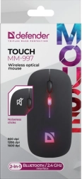 Stílusos DEFENDER Touch vezeték nélküli egér a zavartalan munkát biztosító halk kattintást, a megbízható kettős csatlakozást (Bluetooth + 2,4 GHz), a látványos RGB háttérvilágítást és a pontos 800/1200/1600 DPI beállítást egyesíti. A beépített, újratölthető akkumulátornak köszönhetően spórolhat az elemeken, a fekete kivitel pedig egyaránt illik irodába és otthoni környezetbe.