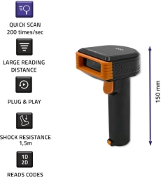 Nagy teljesítményű, vezeték nélküli Qoltec vonalkódolvasó raktárakba, kiskereskedelembe és logisztikába, amely gyors 1D és 2D kódolvasást, akár 40 órás üzemidőt, automatikus üzemmódot és 1,5 m-es ejtésállóságot kínál. Egyszerű beüzemelés a Plug&Play funkciónak köszönhetően, kényelmes töltés a dokkolóállomásban, valamint megbízható hangjelzés a sikeres beolvasásról.