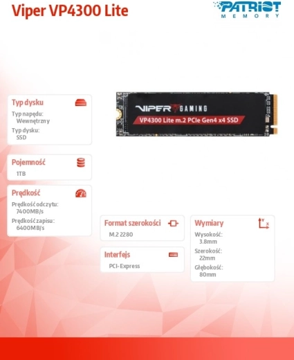 Gyors és megbízható tárhely játékhoz és munkához: a Viper VP4300 Lite 1 TB egy M.2 NVMe SSD PCIe Gen4 x4 interfésszel, teljes NVMe 2.0 kompatibilitással, PC-hez és PlayStation 5-höz. Akár 7400 MB/s szekvenciális olvasást és 6400 MB/s írást kínál, vékony grafén hűtőbordával a hatékony hőelvezetéshez, valamint akár 800 TBW élettartammal.