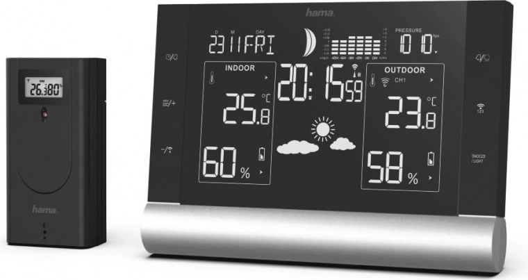 A Meteoállomás Black Line Plus pontos rádióvezérelt időt, időjárás előrejelzést 7 szimbólummal, és hőmérséklet és páratartalom mérését kínálja, mind belső, mind külső környezetben. Ideális azoknak a felhasználóknak, akik nyomon szeretnék követni az éghajlat és az időjárás változásait.