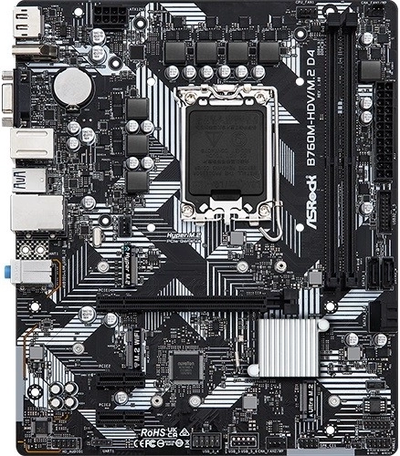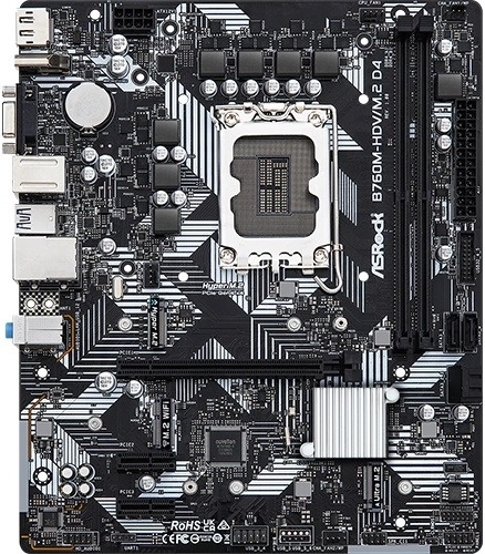A kompakt mATX ASRock B760M‑HDV/M.2 D4 alaplap LGA1700 foglalattal kiváló ár‑érték arányt kínál 12. és 13. generációs Intel processzorokhoz. Biztosítja a gyors M.2 tárhelyet (PCIe 4.0 x4), a stabil 5+1+1 fázisú tápellátást, a DDR4 támogatást akár 5333 MHz‑ig (OC), valamint gazdag csatlakoztathatóságot, beleértve a HDMI, DisplayPort és D‑Sub, a USB 3.2 Gen1 és a 1G LAN csatlakozókat.