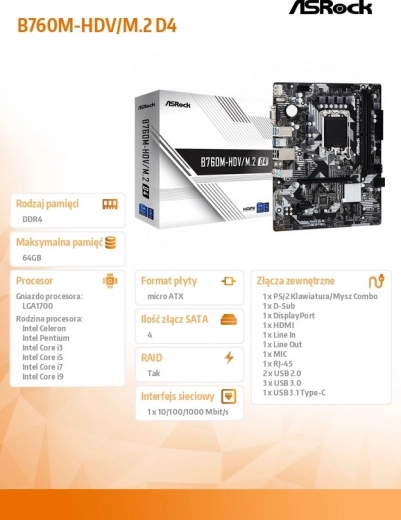 Az ASRock B760M‑HDV/M.2 D4 megbízható microATX alaplap az Intel LGA1700 platformhoz. A B760 chipkészletnek, a minőségi tápellátásnak és a széles körű csatlakozóknak köszönhetően ideális választás játékra és munkára szánt PC‑khez, ahol értékelni fogja a gyors SSD‑ket, a magas DDR4 órajeleket és a modern kijelzőkimeneteket.