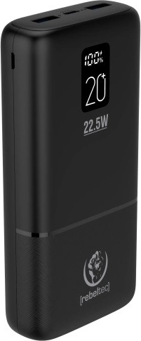 A Rebeltec P20 powerbank megbízható energiaforrás utazáshoz és munkához egyaránt. A 20000 mAh kapacitásnak köszönhetően több teljes feltöltésre is képes telefonhoz, fülhallgatóhoz vagy táblagéphez. A PD 22,5 W gyorstöltés támogatása garantálja, hogy a kompatibilis eszközöket gyorsan és biztonságosan töltheti.
