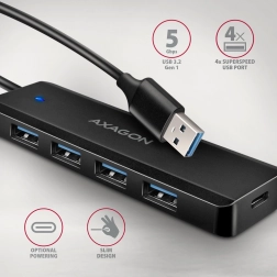 Az AXAGON HUE‑C1A praktikus utazó hub azonnal négy teljes értékű USB‑A portot ad akár 5 Gb/s átvitellel a villámgyors adatmásoláshoz. A fix, 19 cm-es kábel megkönnyíti a csatlakoztatást laptopokhoz és asztali PC-khez, a kompakt ház mindössze 37 g tömegű, így bármelyik táskába belefér.