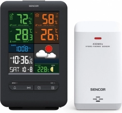 Bemutatjuk a Sencor időjárás-állomást, amely a modern dizájnt praktikus funkciókkal ötvözi. A 5,4″-os színes kijelzőnek köszönhetően könnyedén elolvashat minden szükséges információt az időjárásról, beleértve az ikonikus előrejelzés megjelenítését: napos, félfelhős, borult, eső és hó.