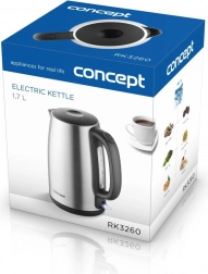 A Concept 1.7l RK3260 gyorsforraló 2200 W-os teljesítménnyel pillanatok alatt melegíti fel a vizet kávéhoz vagy teához. A rozsdamentes acél gyorsforraló tökéletesen illik minden modern konyhába köszönhetően elegáns kialakításának és praktikus funkcióinak.
