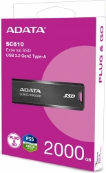 Az ADATA SC610 kompakt és hordozható külső SSD lemez, amely 2000 GB nagy kapacitással rendelkezik. Az USB 3.2 Gen2 támogatás révén akár 10 Gb/s áteresztőképességet ér el, amely gyors és hatékony adatátvitelt tesz lehetővé.