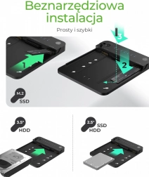 Egyszerű telepítés: Eszközök nélkül használható könnyű csatlakozási kialakítás lehetővé teszi, hogy 2,5"/3,5" lemezeket vagy M.2 SSD-ket könnyen behelyezzen a slotba.