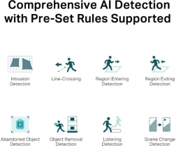 Kulcsfontosságú AI funkciók: Fejlett algoritmusok lehetővé teszik az emberek és járművek felismerését, így pontosabb eseményeket kap és az igényeknek megfelelően állíthatja be a riasztási szabályokat.