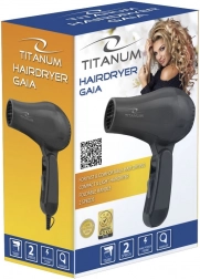 A TITANUM GAIA utazó hajszárító könnyű, és az összecsukható nyélnek köszönhetően könnyen elfér bármely táskában. A fekete kivitel és a tartós, kiváló minőségű műanyag ház hosszú élettartamot és kényelmes használatot biztosít a fürdőszobában és utazáskor is.