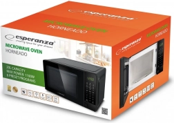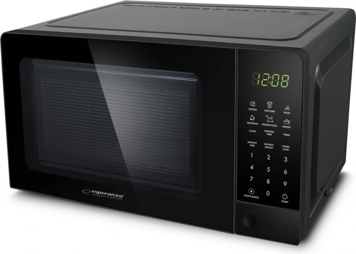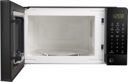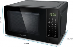 A mikrohullámú sütő elegáns fekete kialakítású, digitális kezelőpanellel és kijelzővel, amely megkönnyíti a főzés, a kiolvasztás és a melegítés funkcióinak beállítását.