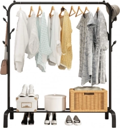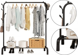 Ez a szabadon álló fogas ruhákhoz és kabátokhoz bőséges helyet kínál az akasztáshoz, miközben praktikus polcot ad a cipők, dobozok vagy kosarak tárolására. A acélcsövekből készült, fekete felületkezelésű masszív váz hosszú élettartamot és elegáns, minimalista dizájnt biztosít, amely bármely belső térhez illik.