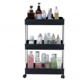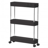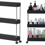 Praktikus, guruló, 3 polcos állvány elegáns fekete színben a konyha, fürdőszoba és nappali könnyű rendszerezéséhez. A kompakt méreteknek, a kerekes, mobil kialakításnak és a stabil fém és tartós műanyag kivitelnek köszönhetően áttekinthető tárolást kínál fűszereknek, kozmetikumoknak, könyveknek és dekorációknak.