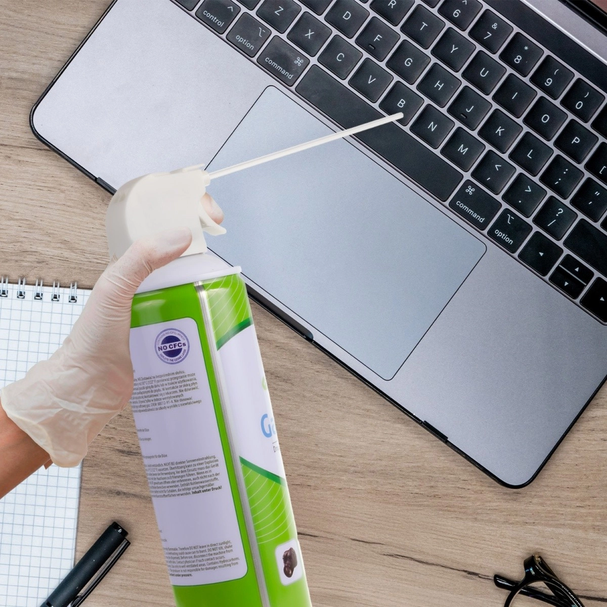 A GREENBLUE sűrített levegő 400 ml-es palackban ideális az érzékeny elektronika rendszeres karbantartásához. A vékony kapilláris fúvókának köszönhetően a levegősugarat pontosan oda irányíthatja, ahol szükség van rá, és könnyedén eltávolíthatja a port, morzsákat vagy pihéket a keskeny résekből és sarkokból.