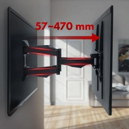 Ez a strapabíró fali tartó kényelmes elhelyezést biztosít a televíziónak a nappaliban, hálószobában vagy dolgozószobában. A dupla csuklós karnak köszönhetően könnyedén kihúzhatja a TV-t a faltól 57–470 mm-re, elforgathatja a kívánt szögbe, és +2°– -12° tartományban megdöntheti a tükröződésmentes, tökéletes rálátásért.