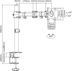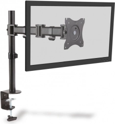 Univerzális asztali monitortartó egy monitorhoz 27"-ig, 8 kg teherbírással, amely biztosítja az ergonomikus beállítást, a 360°-os forgatást (pivot) és a ±45°-os döntést. A rögzítés stabil asztallapra szorító csipesszel történik, kompatibilis a VESA 75x75 és 100x100 szabvánnyal. Az integrált kábelvezetés rendezetté és áttekinthetővé teszi a munkaterületet.