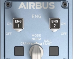 Az Airbus fojtókar paneljének ergonómikus replikája valósághű indítást és leszállást kínál mechanikus reteszekkel.