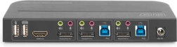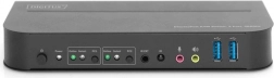 A Digitus KVM kapcsoló lehetővé teszi két számítógép csatlakoztatását 2× DisplayPorton keresztül, és egyetlen monitort, billentyűzetet és egeret oszt meg. A kimenet HDMI 2.0 vagy DisplayPort 1.2 felületen vezethető ki, 4K@60 Hz felbontással, beleértve a HDCP 2.2, HDR és FreeSync támogatást. A váltás történhet az előlapi gombbal vagy a mellékelt IR távoli vevővel.