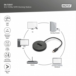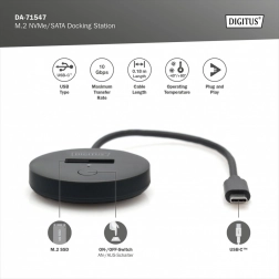A DIGITUS dokkoló állomás lehetővé teszi a tárhely kezelését és bővítését NVMe (B+M Key / M-Key) és SATA (B+M Key) szabványú M.2 SSD-kkel. A USB‑C 3.2 Gen2 csatlakozásnak köszönhetően akár 10 Gbps sebességet érhet el, így a nagy fájlok átvitele, a mentés és a multimédiás munka gyors és folyamatos.