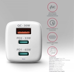 Az AXAGON ACU-DPQ65W GaN utazó fali töltő akár három mobil eszköz egyidejű gyors töltését is lehetővé teszi. A 65 W összteljesítménynek köszönhetően a töltő képes laptopok, telefonok és egyéb mobil eszközök maximális sebességű töltésére. Az adapter egy szabványos USB-A csatlakozót, valamint két, kétoldalas USB-C csatlakozót kínál.