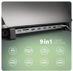 Az AXAGON HMC-10HLS LONGER univerzális, 9 az 1-ben dokkoló megoldást kínál modern USB-C eszközökhöz. Csatlakoztasson monitort akár 4K/60 Hz felbontásban, négy USB perifériát, vezetékes hálózatot GLAN segítségével, és használja a SD/microSD kártyaolvasót a gyors adatátvitelhez. A USB-C PD 100 W port tápot ad és tölti a notebookot, így nem veszít el egyetlen portot sem.