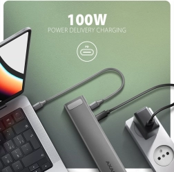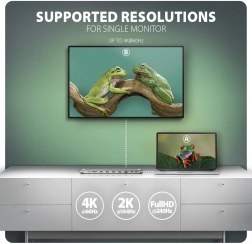 A gyors USB 3.2 Gen 1 (5 Gb/s) interfésznek köszönhetően gond nélkül kezeli akár két külső meghajtó egyidejű használatát, képes telefon vagy tablet töltésére akár 1,5 A/5 V értékig, és támogatja a HDR-t, a magas képfrissítési frekvenciákat (akár 2K/144 Hz, Full HD/240 Hz) és a HDCP 1.4–2.3 szabványokat. Az alumínium konstrukció tartósságot és passzív hűtést biztosít; a mellékelt alátétek lehetővé teszik a hub használatát állványként a notebook jobb hűtéséhez.
